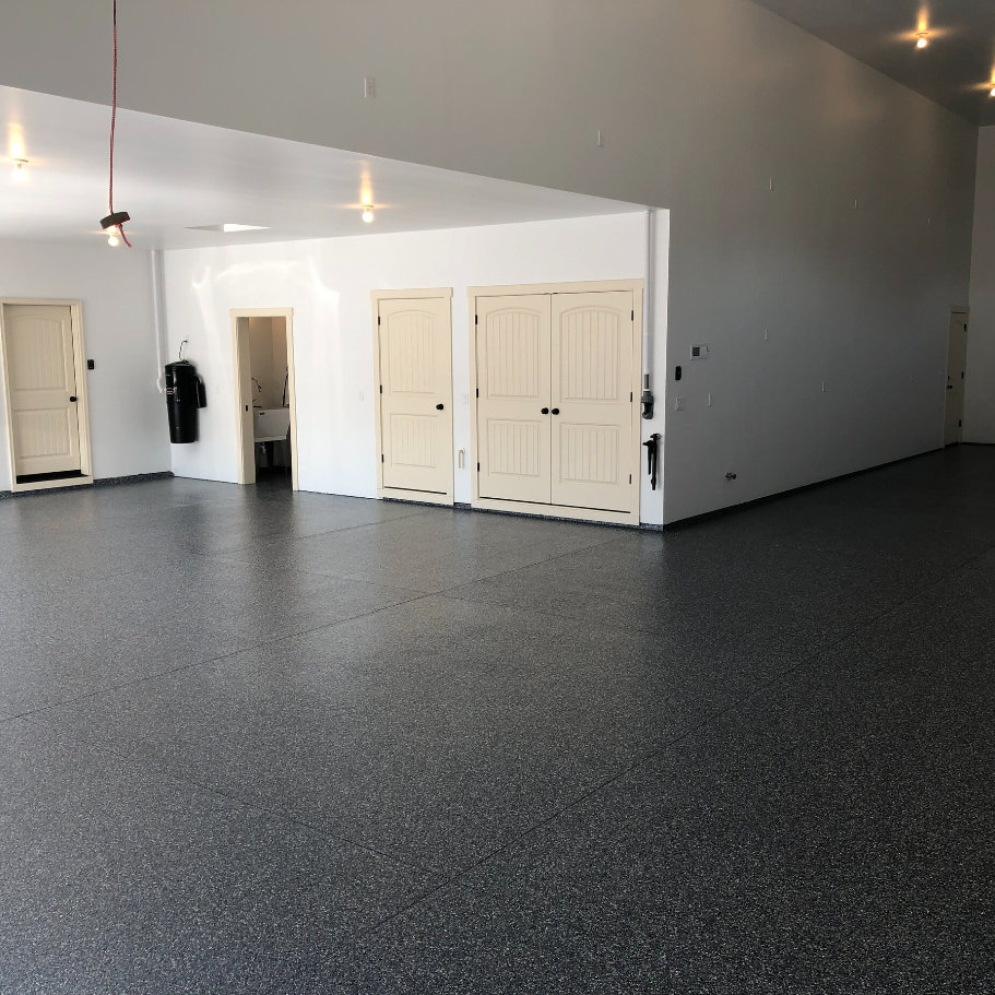 Next, we apply a high-build primer coat, which acts as both a bonding layer and a receiver layer for the decorative flakes. While the coating is still wet, we broadcast decorative flakes to full rejection, meaning every inch of the surface is completely covered. This technique ensures consistent color distribution, superior durability, and excellent slip resistance, making it a preferred choice for garages, commercial spaces, and industrial environments.